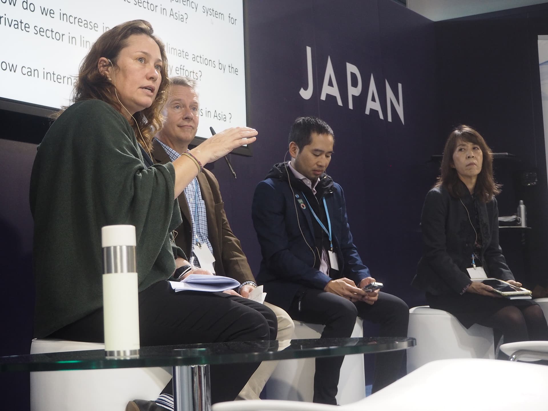 登壇者ーNicolette Bartlett (CDP), Niclas Svenningsen (UNFCCC), Dan Pathomvanich (NR Instant Produce Public Company), 吉高まり(三菱UFJリサーチ&コンサルティング)