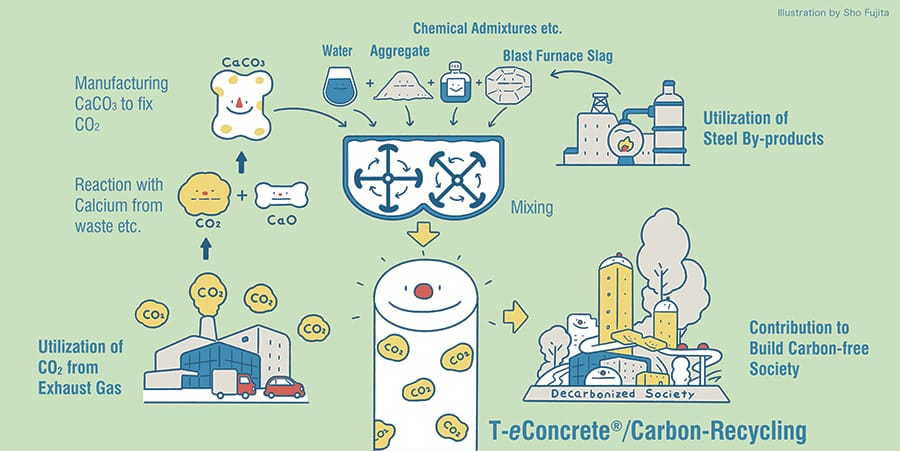 Carbon-Recycled Concrete: “T-eConcrete®/Carbon-Recycle” enables to take in a large amount of CO₂ and make the CO₂ balance of concrete negative. T-Green® Multi Solar See-through type offers daylighting with power generation Solid type offers outstanding design Our Carbon-Recycled Concrete, prepared with calcium carbonate produced by reacting calcium with CO₂ captured from the atmosphere and the exhaust gases as well as large amount of ground granulated blast furnace slag, an industrial by-product, has achieved carbon-negative.