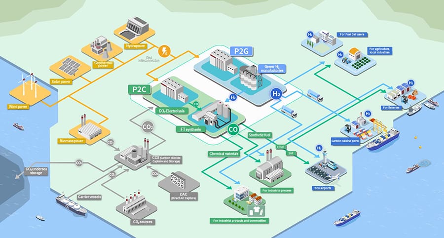 Toshiba Group is advancing development and social implementation of P2C: the use of renewable energy and hydrogen to convert CO₂ into valuable chemicals.