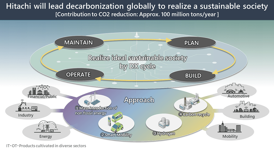 日立は、地球環境と人々の快適な生活の両立をめざし、「グリーン」「デジタル」「イノベーション」を成長ドライバーとして、社会イノベーション事業を展開しています。グリーンでは、Climate Change Innovatorとして、気候変動の緩和・適応に貢献します。2050年までにバリューチェーン全体のカーボンニュートラルを達成するとともに、さまざまな分野のお客さまの脱炭素化に貢献します。