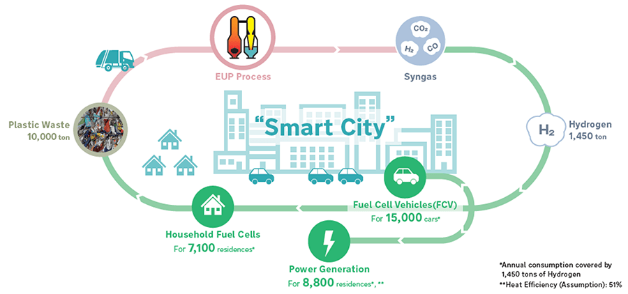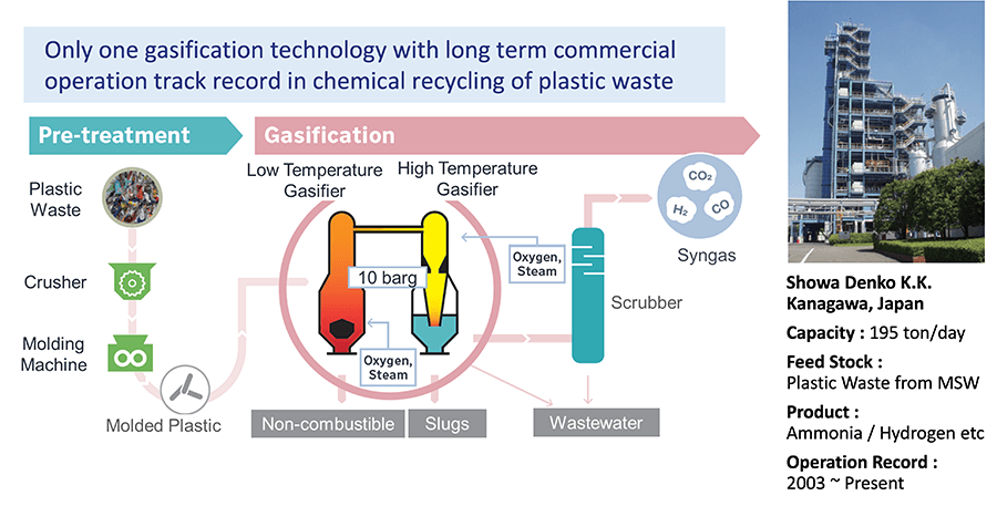 日揮グループは、本事業を可能とする廃プラスチックのガス化技術EUPを提供します。EUPは世界で唯一廃プラスチックのガス化ケミカルリサイクルにおいて長期商業運転実績を有している技術であり、廃プラスチックの安定的な処理と、化学原料および水素の効率的な生産が可能です。