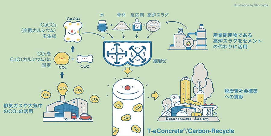 カーボンリサイクル・コンクリート:「T-eConcrete®/Carbon-Recycle」は大量のCO₂を取り込み,コンクリートのCO₂収支をマイナスにすることが可能です. T-Green® Multi Solar