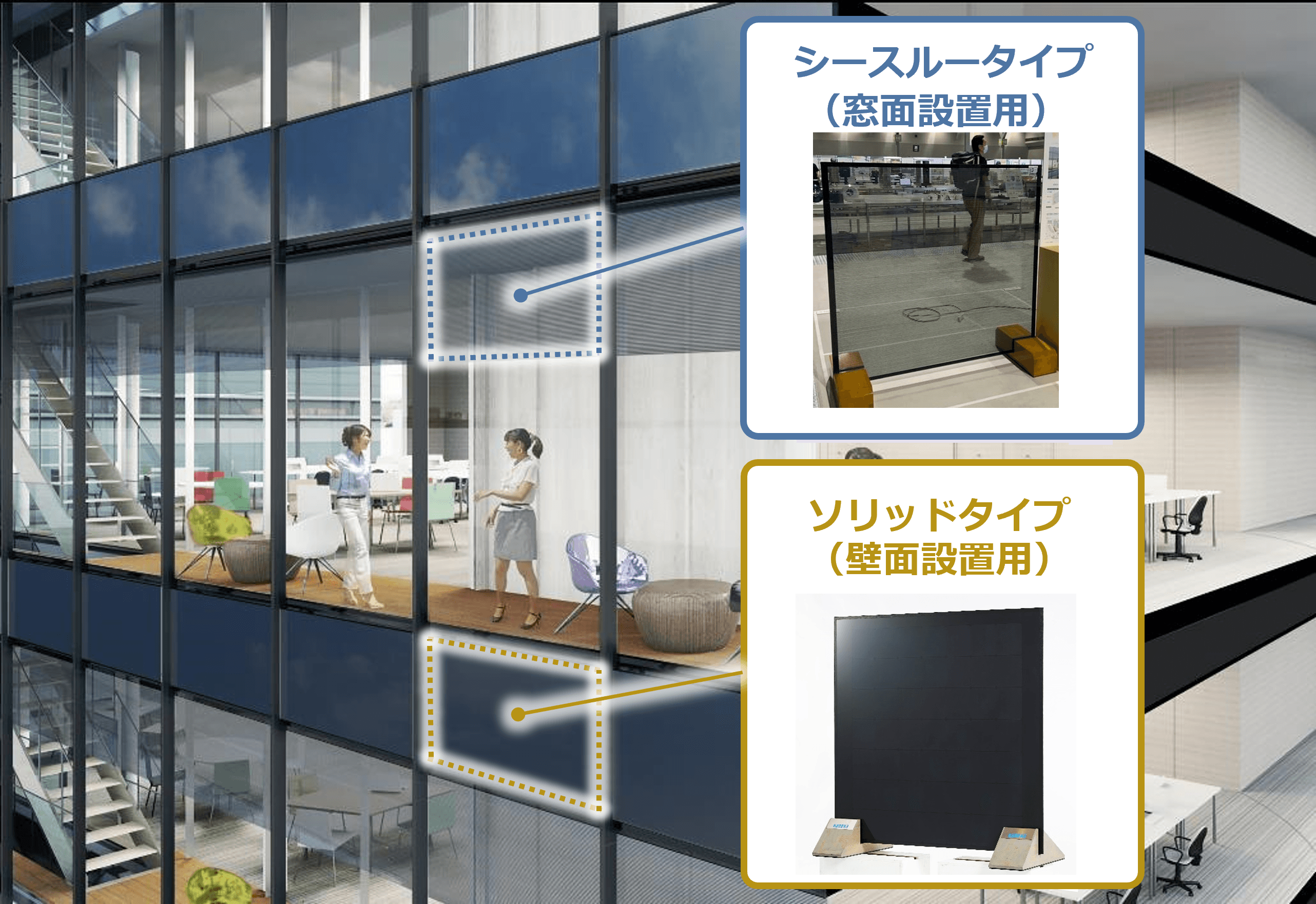 採光と発電を両立する「シースルータイプ」 意匠性にも優れた「ソリッドタイプ」Carbon-Recycled Concreteは、大気や排気ガスのCO₂をカルシウムに吸収させて製造した炭酸カルシウム,ならびに産業副産物である高炉スラグを大量使用することで,カーボンネガティブを実現しました。