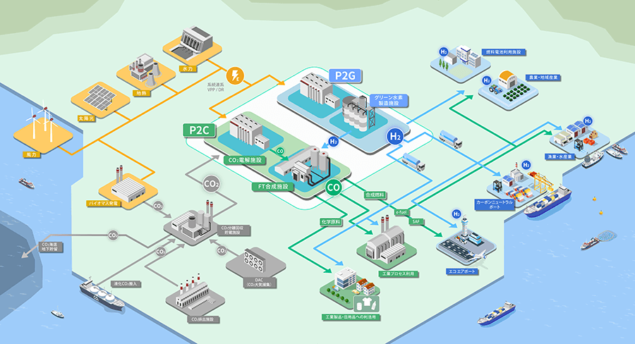 東芝グループでは、CO₂を原料として再エネを用いて有価物を生み出すPower to Chemicals(P2C)の技術開発および社会実装を進めています。