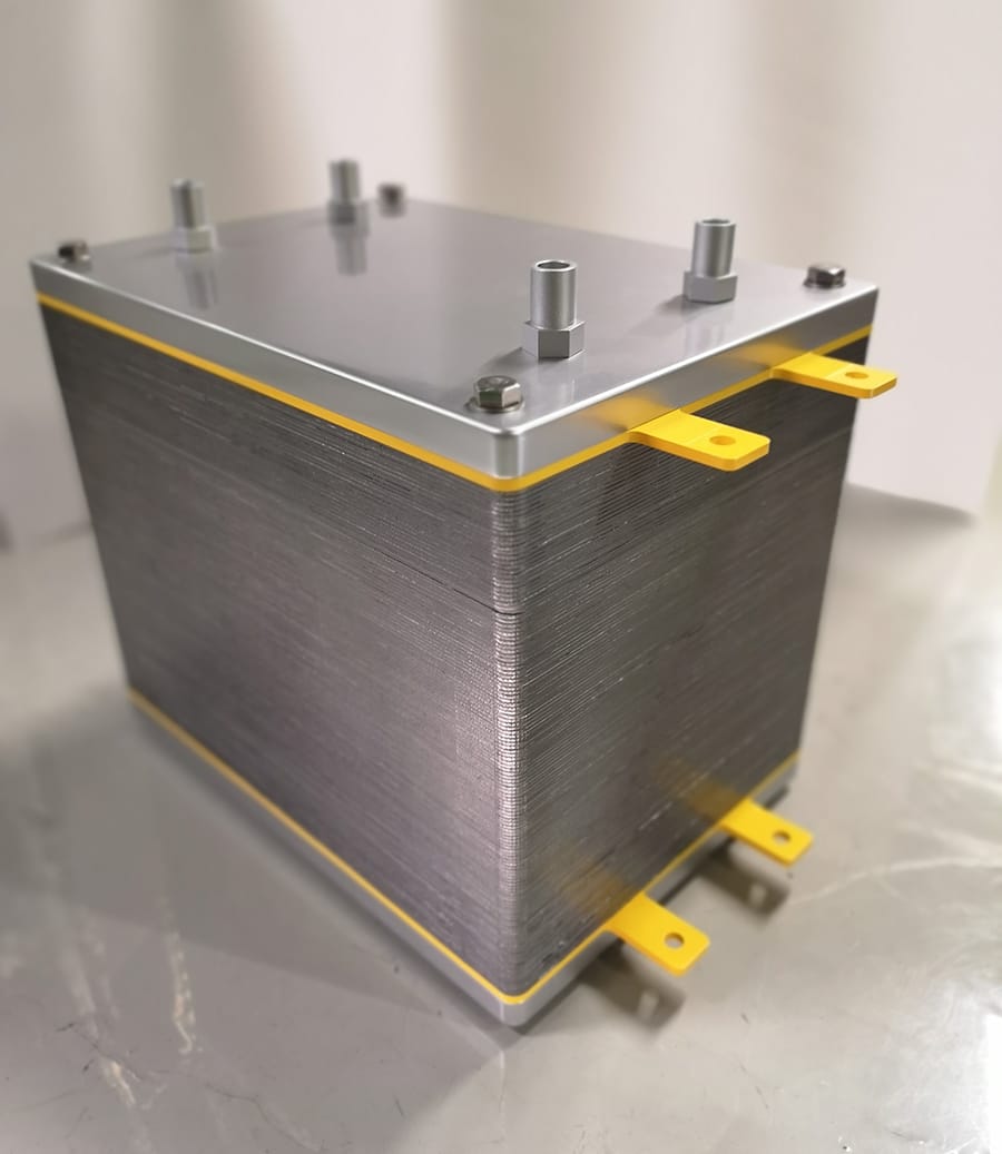 CO₂資源化による炭素循環社会モデル CO₂電解セルを百枚以上積層したフルスタックモデル(展示品) カーボンニュートラルを目指す中で、どうしても無くせないCO₂排出については、これを有効活用していく技術が必要とされています。