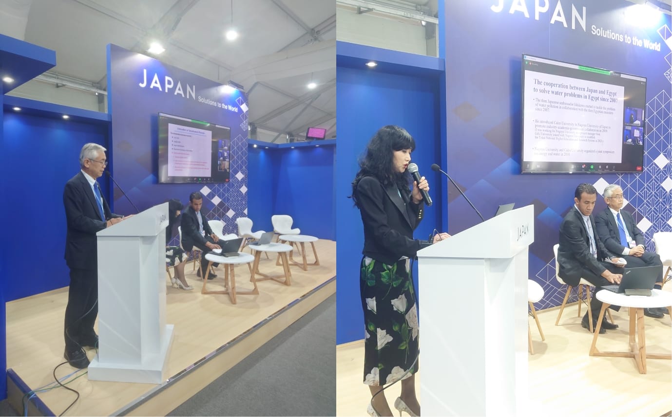 セミナー“Aiming for Environmental Friendly and Carbon Neutral System of Desalination and Water Treatment(環境に配慮したカーボンニュートラルな造水及び水処理システムを目指して)”では、石川薫元在エジプト日本大使がナイル川の汚染問題と両国連携による浄化活動の成功事例を紹介し、東海国立大学機構 岐阜大学 地方創生エネルギーシステム研究センタープロジェクトマネージャーのDr. Maria R. H. Takeuchiはエジプトの水プロジェクトが暗礁に乗り上げた原因と、目標達成のためのリーダーシップについて講演した。続いてエジプトSouth Valley大学のDr. Khaled Ali Mohammed Ali はエジプトの現状と飲料水に関する研究について、板谷義紀前センター長はカーボンニュートラルな海水淡水化システムについて、京都大学エネルギー理工学研究所の大垣英明教授は環境に配慮したファインバブルを用いた水処理について講演した。