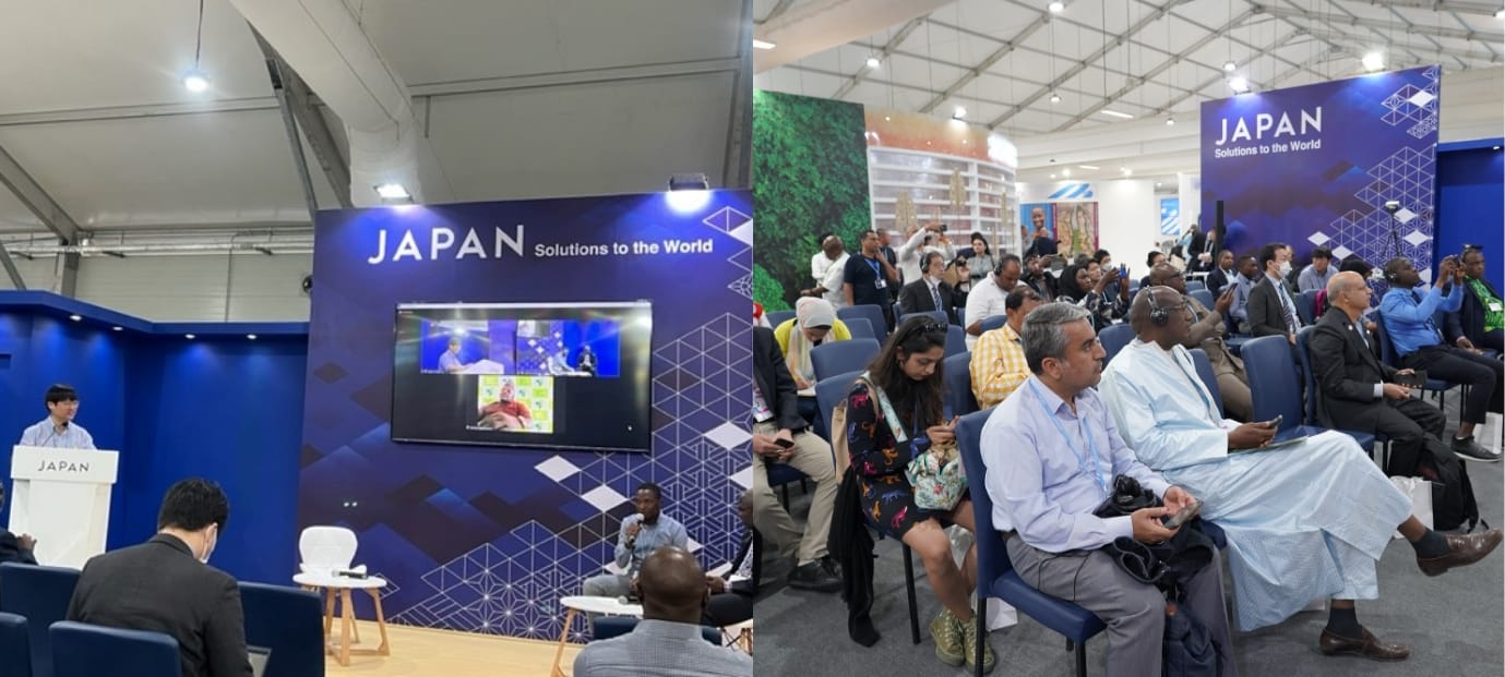 - 「持続可能な農業と食料安全保障」をテーマとするセミナーを開催し、冒頭、農林水産省より「みどりの食料システム戦略」の概要を紹介するとともに、同戦略に基づく、水田からのメタン排出を抑制する間断(かんだん)灌漑技術や、窒素肥料を減らしても生産性を維持可能なBNI強化作物等の脱炭素技術に関する研究動向の報告、アフリカでのデジタル技術を活用した生産性向上の取組等、気候変動対策に資する取組を、参加した約100名に紹介しました。