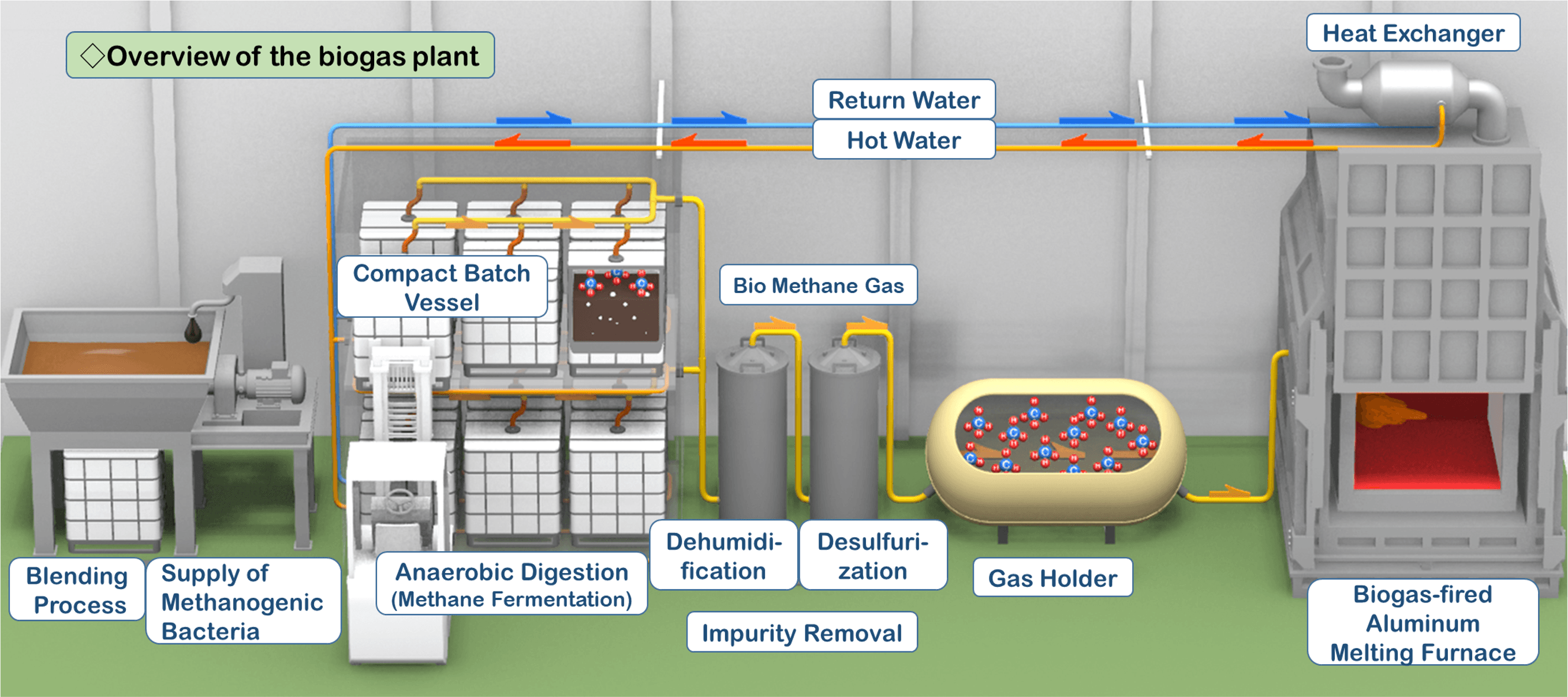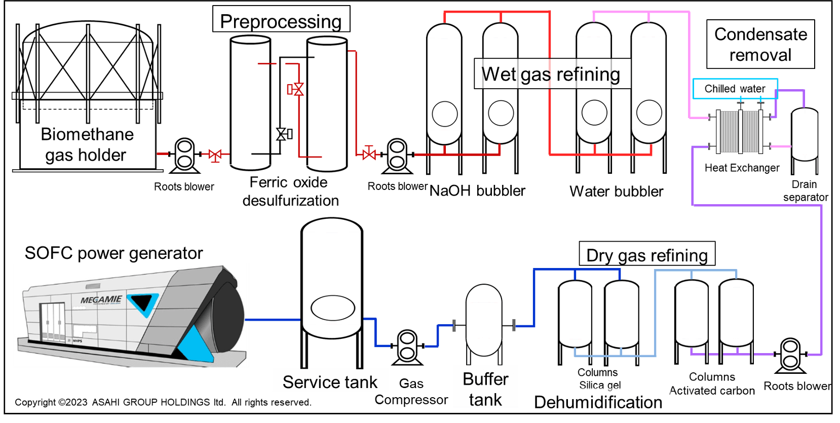 Photo of Wastewater treatment plant, Biomethane gas refining plant, and the 200 kW solid oxide fuel cell (SOFC) in operation at the Asahi Breweries Ibaraki plant. Schematic Flow Diagram of SOFC power generation using biomethane from Brewerie's wastewater Asahi Group Holdings, Sumitomo Mitsui Finance & Leasing (SMFL), Kyushu University, has developed a technology to generate electricity with a 200 kW fuel cell by highly refining biomethane gas, a by-product of the wastewater treatment process of Brewery, supported by the Ministry of the Environment.The system had been in continuous operation for 16,458 hours.Methane has traditionally been used as a source of combustion heat, but we believe it can contribute to the diversification of the energy portfolio by providing society with an economical, low-carbon reason.Asahi aim to expand this technology by simplifying refining process in the future.SMFL will support the spread of fuel cells by providing various financial services, including leasing, to provide funding and reduce initial costs.