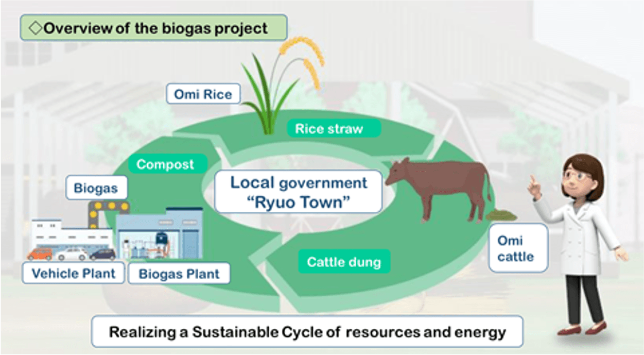 We tackle to creating a sustainable cycle of resources and energy in local towns based on Nature-based Solutions. This approach can be applied anywhere in the world as a local SDGs. We developed low-moisture methane fermentation process and plant which is simplified with automotive manufacturing know-how. The decarbonization in the industrial sector triggered "Together for Action". The local main industries, crops and livestock farmers, and the automobile industry, each have their own challenges: organic farming of Omi Rice, waste management of Omi cattle dung, and decarbonization of high-temperature heating.