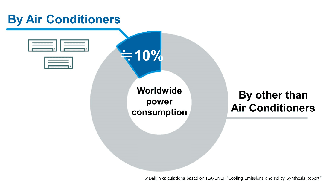 *Our calculation based on IEA/UNEP "Cooling Emissions and Policy Synthesis Report”By precisely controlling the compressor, the heart of an air conditioner. air conditioners equipped with inverters can achieve both a significant reduction in power consumption and comfort. The G7 and G20 highlighted the importance of enhanced energy efficiency as the “first fuel” to achieve net-zero emissions by 2050 at the latest. Currently, Air Conditioners(AC) account for about 10% of the world’s total electricity demand, but development in emerging countries has been increasing energy demand for AC on average 4% per year. High-efficient inverter AC precisely controls the rotation speed of the air conditioner compressor in line with ambient conditions to reduce power consumption. While the ratio of inverter AC has reached nearly 100% in markets such as Japan and Europe, such levels are still low in the whole world. Through this exhibition, we will introduce you of the potential of inverter AC for decarbonization and the advantages of Daikin's high-efficient inverter AC.