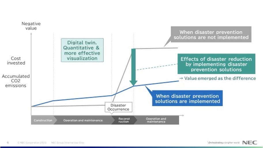 ~ Creating value in disaster mitigation by implementing disaster prevention solutions ~To achieve carbon neutrality, it's important to control CO2 emissions generated as a result of disaster recovery. To this end, it's desirable to increase the inflow of not only public funds but also private-sector funds to promote the adaptation projects to cope with extreme weather. Therefore, we'll create and globally disseminate "Digital Transformation to accelerate Adaptation Finance for Climate Change," a financial scheme to attract private-sector funds for adaptation projects, based on the advanced efforts and disaster prevention solutions of Japan, a disaster-prone country. Specifically, we'll create a mechanism to visualize the disaster prevention and environmental value of adaptation projects prior to their introduction by utilizing wide-area sensing technology, digital twin technology, etc., and convert them into economic value (premium) that is attractive to investors.