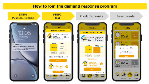 Fig.1:Overview of "Demand Response for Households" Fig.2:How to join to electricity-saving of "Demand Response for Households" "Demand Response for Households" is a behavior-changing demand response service that encourages customers to save energy through a dedicated smartphone app(Fig.1, Fig2). By implementing this service, energy utilities can either restrict or shift household peak electricity demand, while simultaneously reducing household CO2 emissions. Since this service is a packaged product, energy utilities can implement it in a short period and at a low cost.
