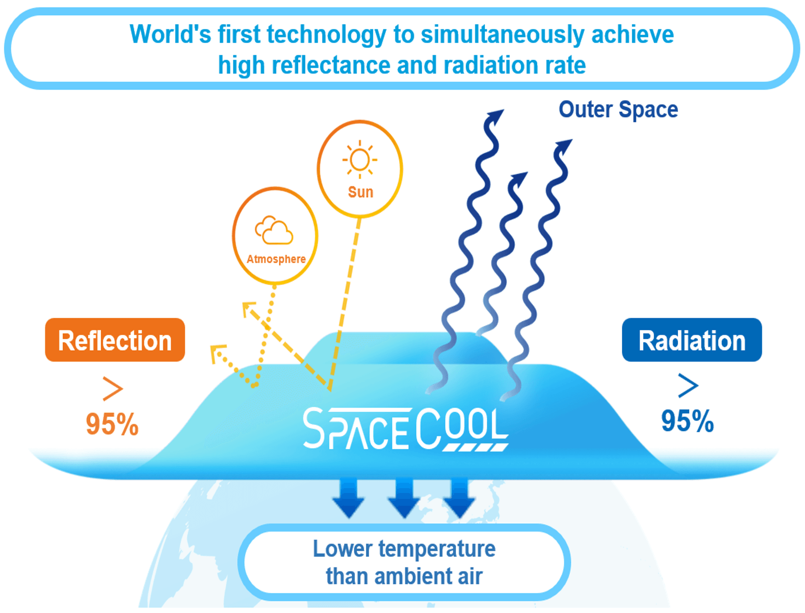 Concept of the material SPACECOOL® Film (White,Silver) SPACECOOL, an electricity-free radiative cooling material uses optical control technology to suppress heat input from sunlight while releasing heat into outer space through an atmospheric window, thereby maintaining temperatures below ambient air even under direct sunlight without consuming any energy. In a cooling performance test, the temperature was reduced by 40°C compared to a sample without the film. SPACECOOL maintains temperatures below ambient air temperature both day and night.