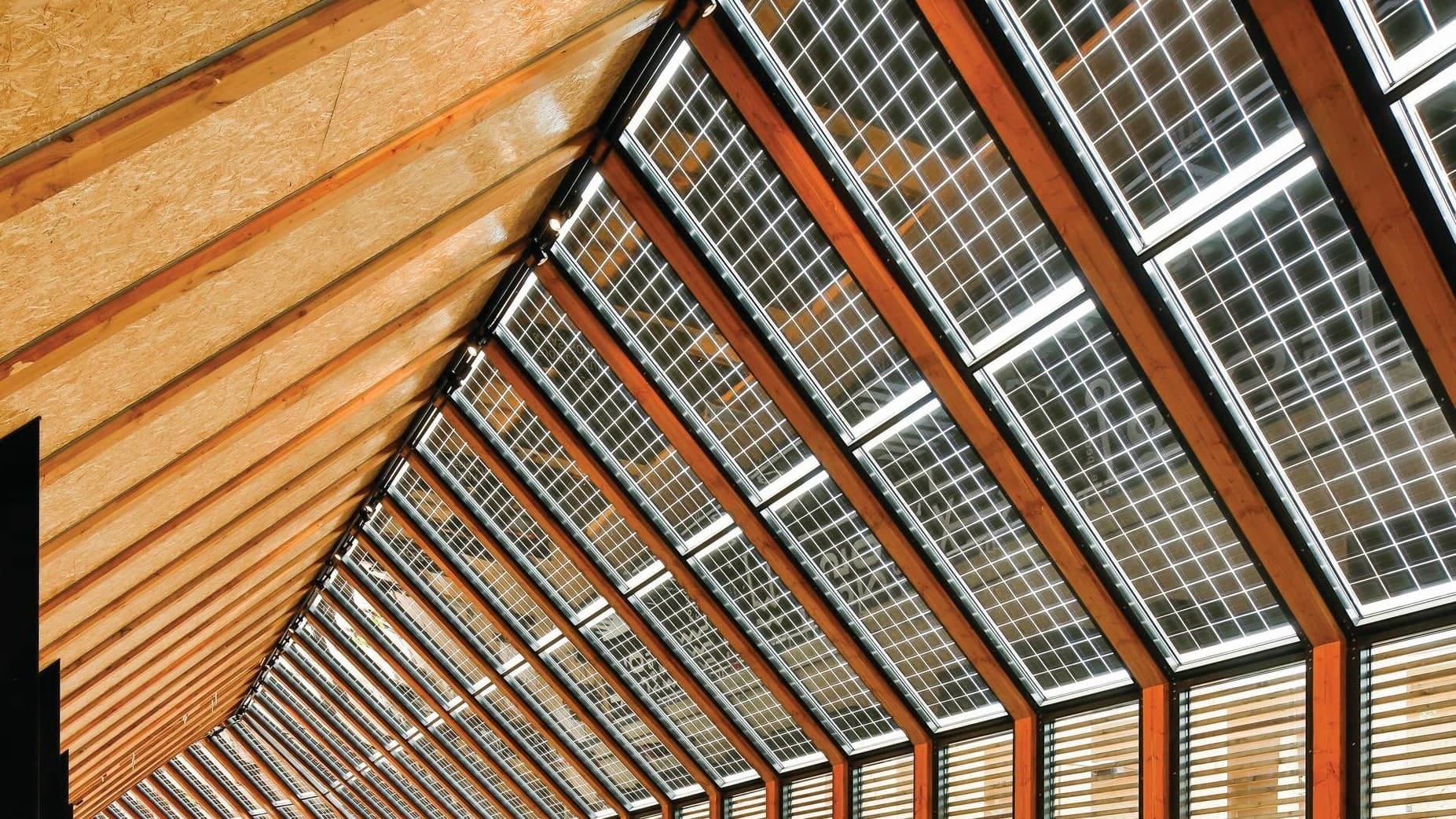 建材一体型タイプの太陽電池モジュール。ガラスの特性を生かして建物の様々な場所で使用でき、採光しながらの創エネが可能。