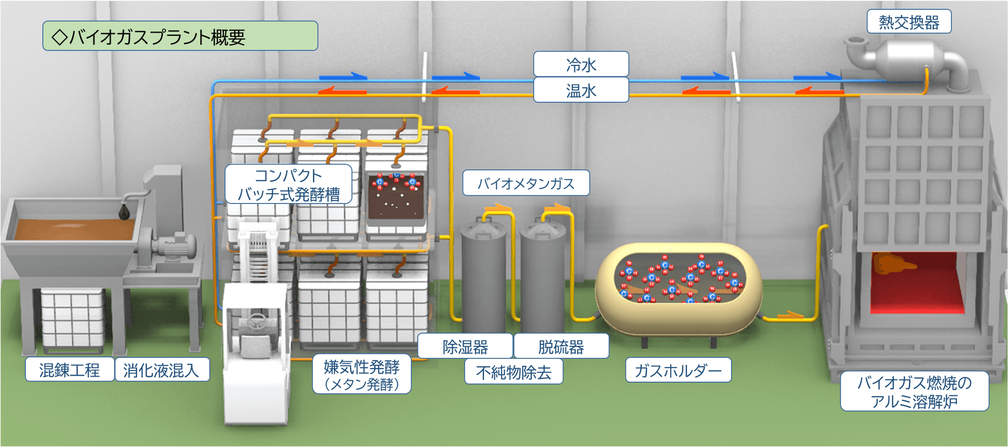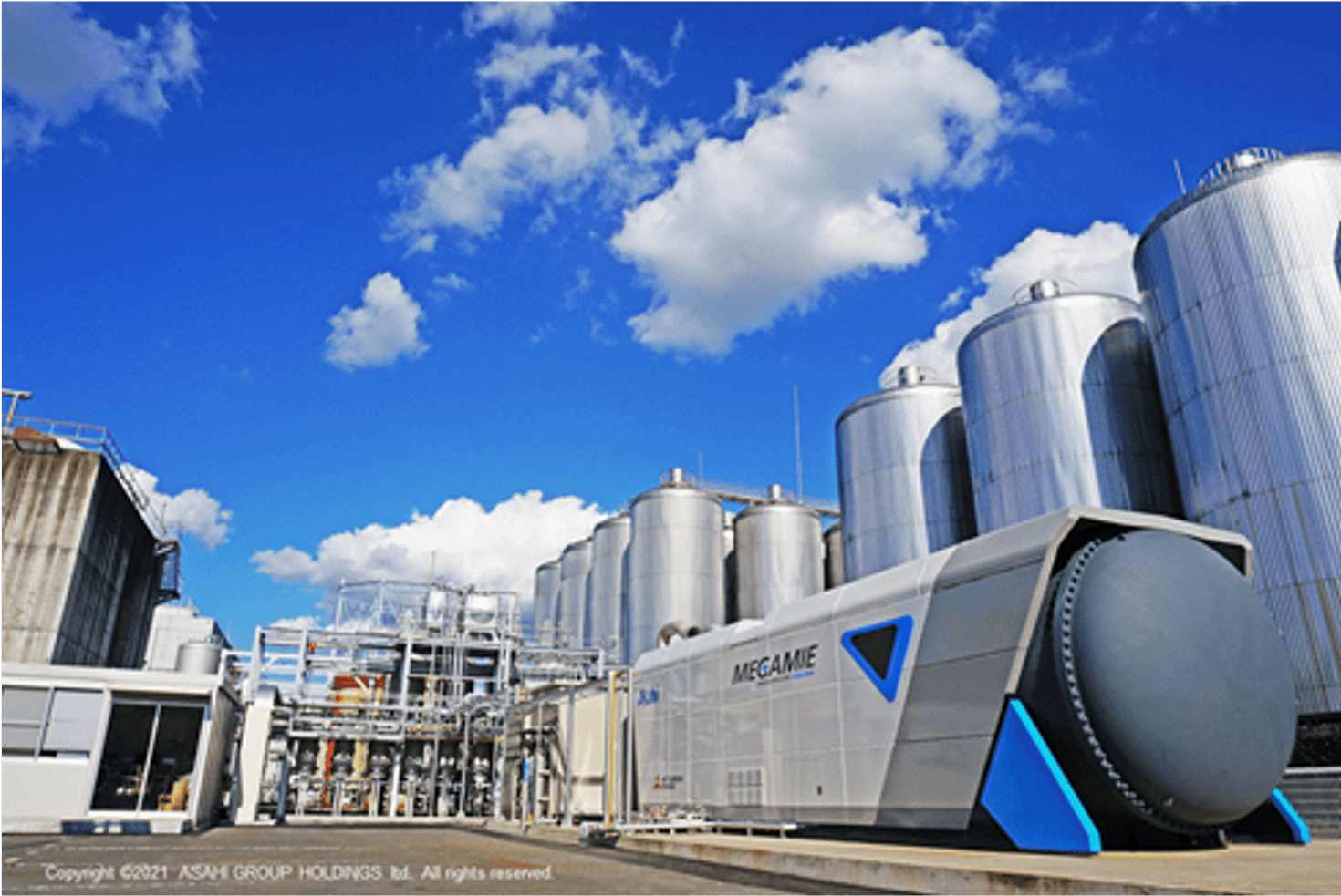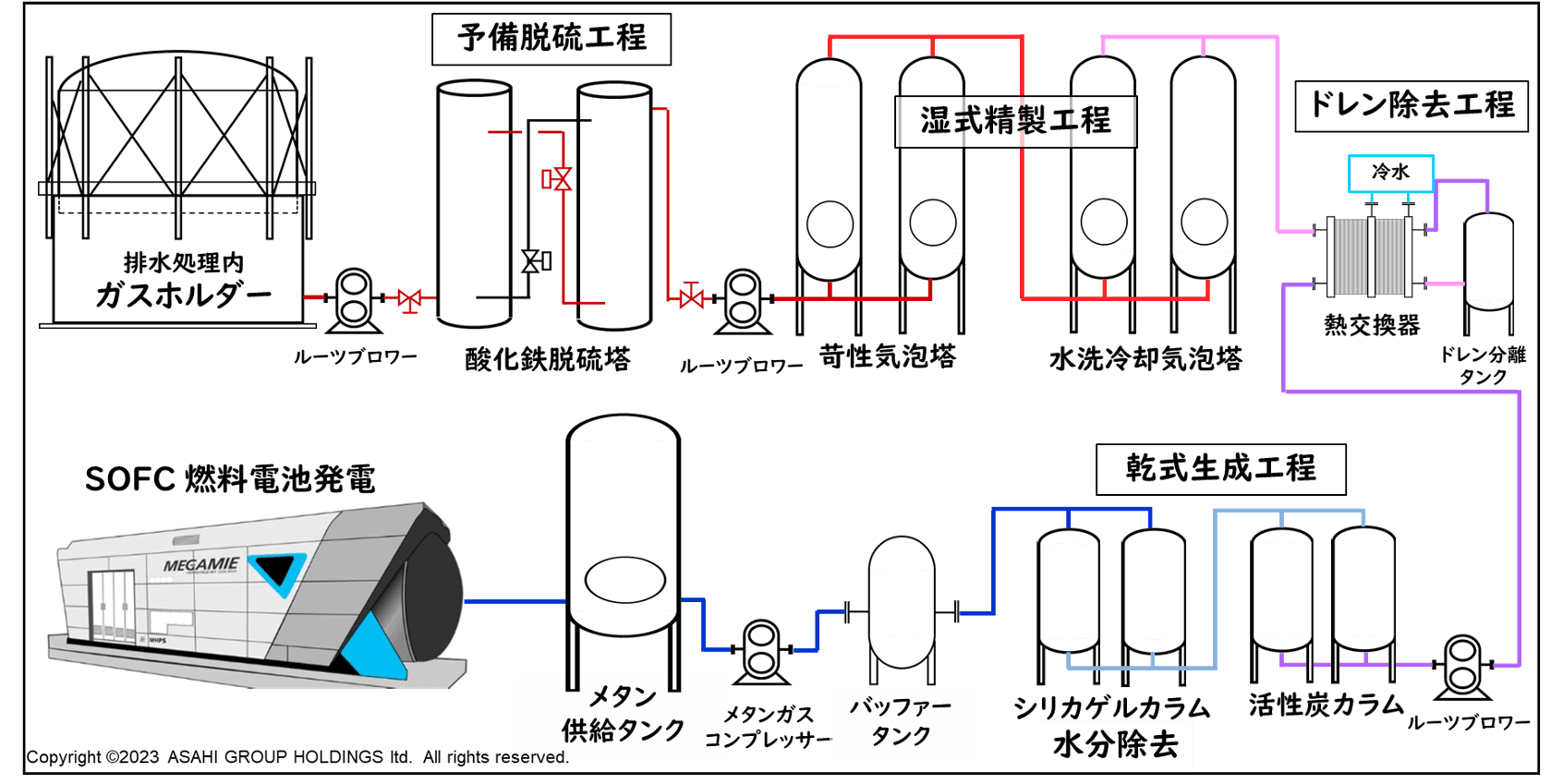 アサヒビール茨城工場で稼働中の、排水処理副生バイオメタンガス精製プラントと、今回精製メタンガスで発電している200kW固体酸化物型燃料電池(SOFC) メタン精製工程~発電 全体概略工程 アサヒグループホールディングスは、アサヒグループ各社、三井住友ファイナンス&リース、九州大学らと共に2019年度より環境省補助事業として、ビール工場の排水処理工程から副生するバイオメタンガスを高度に精製し200kWの固体酸化物形燃料電池(SOFC)で発電する技術を開発した。2023年7月1日現在、連続稼働時間は16,458時間、その内6,252時間が100%メタンガス発電となっている。このメタンガスは従来より燃焼熱源として用いられてきたが経済性や低炭素性から燃やさない選択肢として社会に提供する事で、エネルギーポートフォリオの多様化に貢献できると確信している。今後コンパクト化した安価な精製キットを開発する等、本技術の裾野拡大を目指す。三井住友ファイナンス&リース株式会社は、リースをはじめとする各種ファイナンスサービスを提供することで、資金提供や初期費用の抑制など燃料電池の普及を支援していく。