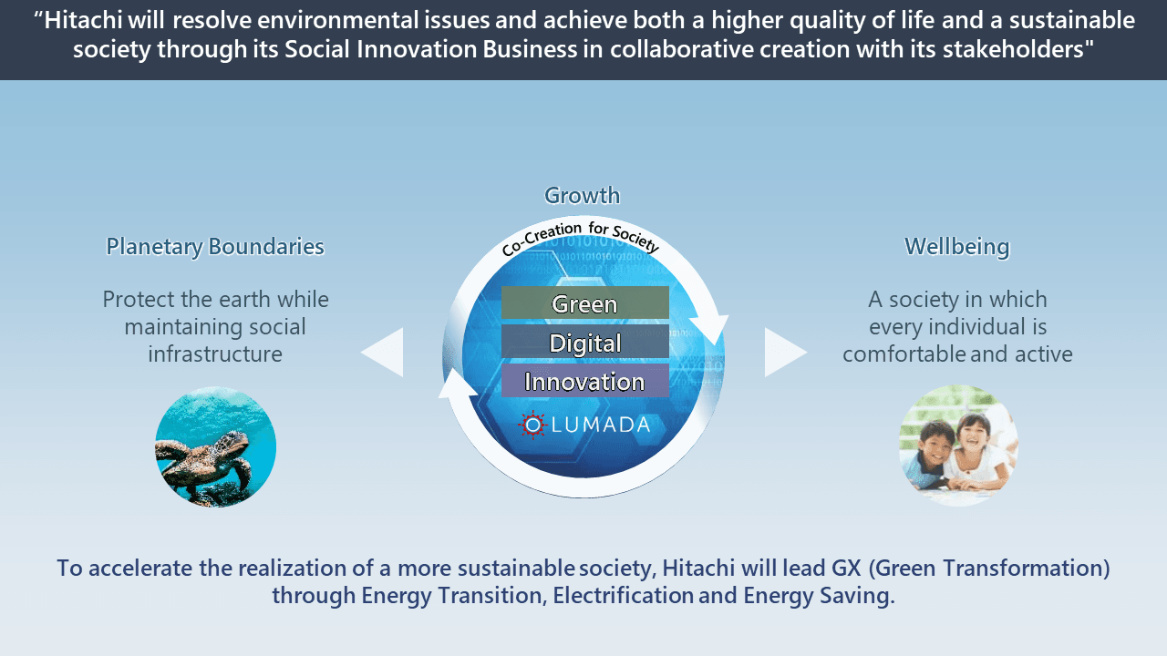 日立は、プラネタリーバウンダリーを超えない社会の維持とウェルビーイングの実現の両立をめざし、データとテクノロジーを駆使して、世界中のお客様やパートナーとともに新たな価値の創出に取り組んでいます。