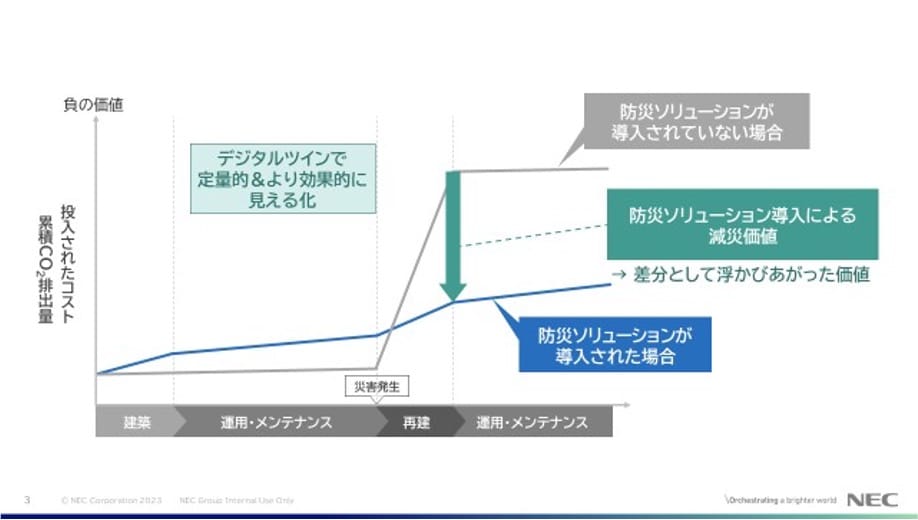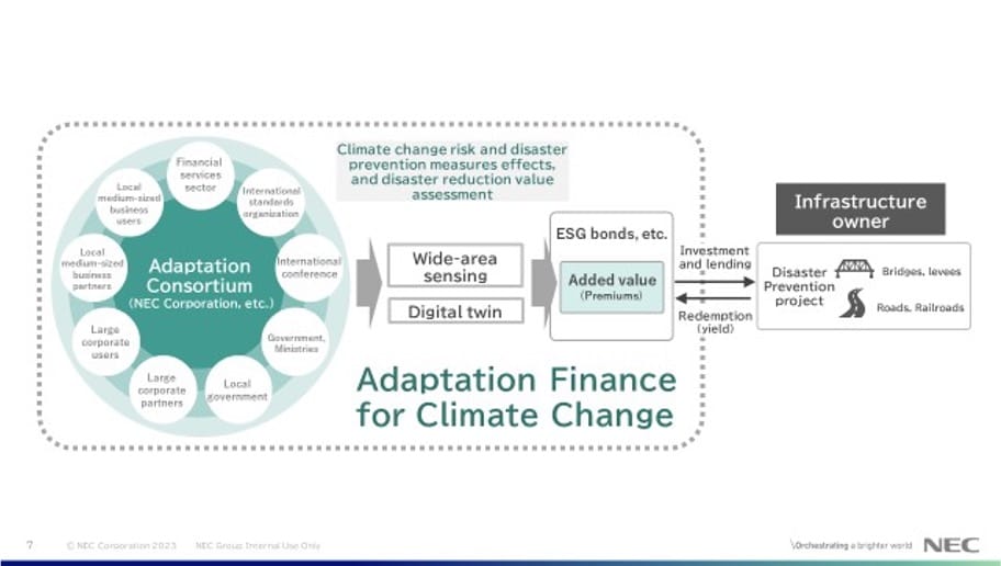 ~ 防災ソリューションの導入によって減災価値を創出 ~世界で排出されるCO2の10%以上が、異常気象に起因する自然災害に関連しているとされ、カーボンニュートラルの実現に向けては災害からの復旧に伴い、発生するCO2の抑制が重要と言える。そのためには、異常気象に対応する適応策プロジェクトの導入を促進するため、公的資金のみならず、民間資金の流入を増やすことが望まれる。そこで、災害大国・日本の先進的な取組みや防災ソリューションをベースに、適応策プロジェクトへ民間資金を呼び込む金融スキームである「気候変動に伴う適応ファイナンスを加速させるDX」を創り上げ世界に向けて発信する。具体的には、適応策プロジェクトの防災価値や環境価値を、広域センシング技術やデジタルツイン技術等を活用しながらプロジェクト導入前に可視化し、投資家からも魅力的に映る経済価値(プレミアム)へと転換する仕組みを創り上げる。