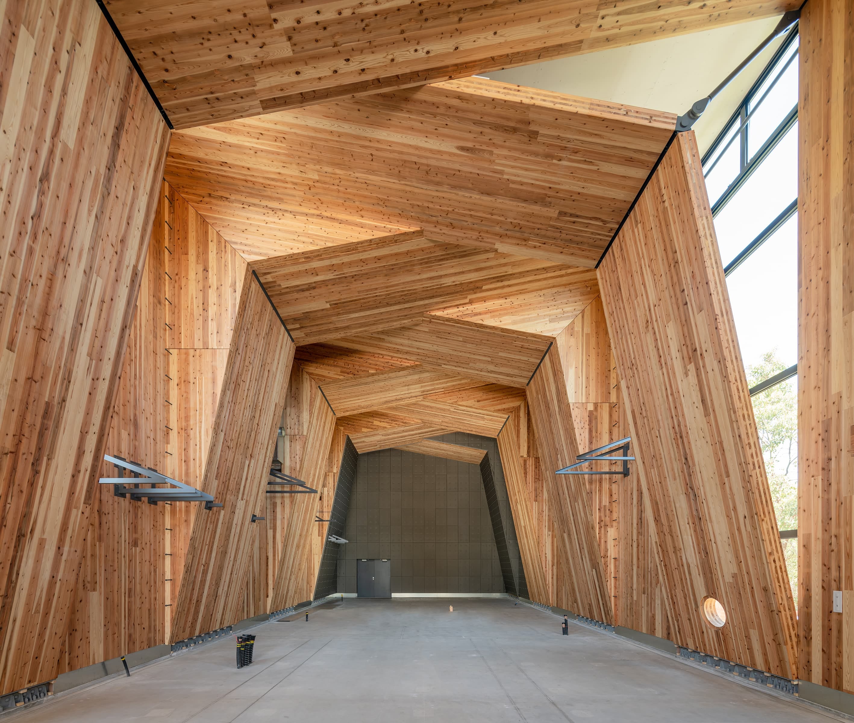 CLT構造としては国内最大となる12mスパンの大空間を実現。ユニット化された3パネル3ヒンジの構造形式により、高速施工が可能です。大成建設株式会社は、建築物のライフサイクルにおけるCO2排出量を実質ゼロにするゼロカーボンビルの建設を推進するため、初期計画段階で建築物のライフサイクルCO2排出量及びCO2削減技術の効果を可視化し、建築物の脱炭素化を体系的に評価するシステム「T-ZCB(ゼロカーボンビル)」を構築しました。