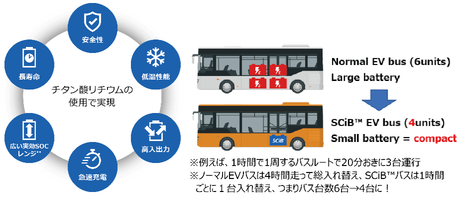 発電から送配電、蓄エネ、省エネ、エネルギーの有効活用まで、社会の至る所で、温室効果ガスの排出を減らしながら、エネルギーの安定供給を支えています。 負極にチタン酸リチウムを使うことで、高い安全性と、6分で80%充電可能な急速充電、2万サイクル以上の超長寿命を両立します。 EVバスへ適用した場合、バスの台数や搭載する電池を削減することができます。「より広い車室」と「軽量化による電費の改善」も期待できます。 カーボンニュートラル社会には、様々なエネルギー技術が必要です。 東芝グループではエネルギーを「つくる」から「かしこくつかう」まで、上流から下流まで一貫したソリューションを提供しています。