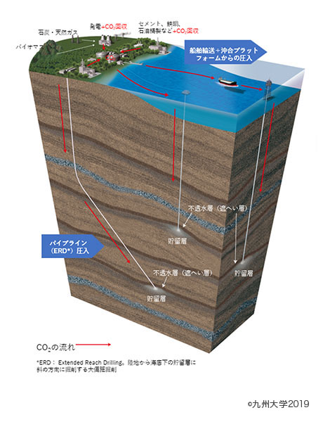ERD:Extended Reach Drilling。陸地から海底下の貯留層に斜め方向に掘削する大偏距掘削