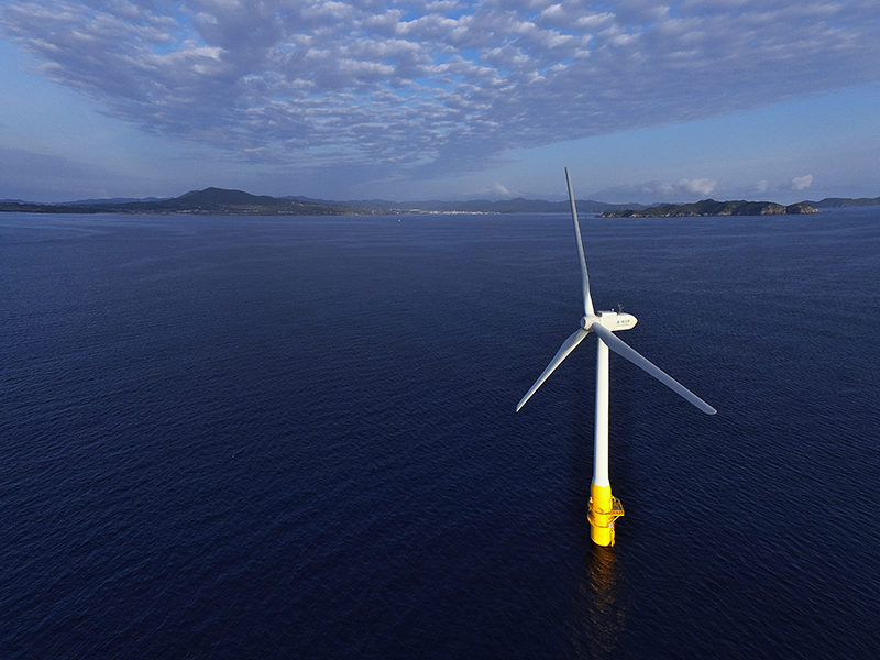 浮体式洋上風力発電施設の支持構造物は、上部に鋼、下部にコンクリートを使用する「ハイブリッドスパー型」と呼ばれる世界初の構造形式を採用し、建造コストの低減と高い安定性を確保、2013年に2MWの浮体式洋上風力発電施設を設置し、毎年来襲する台風にも耐え、2016年より実用化しました。