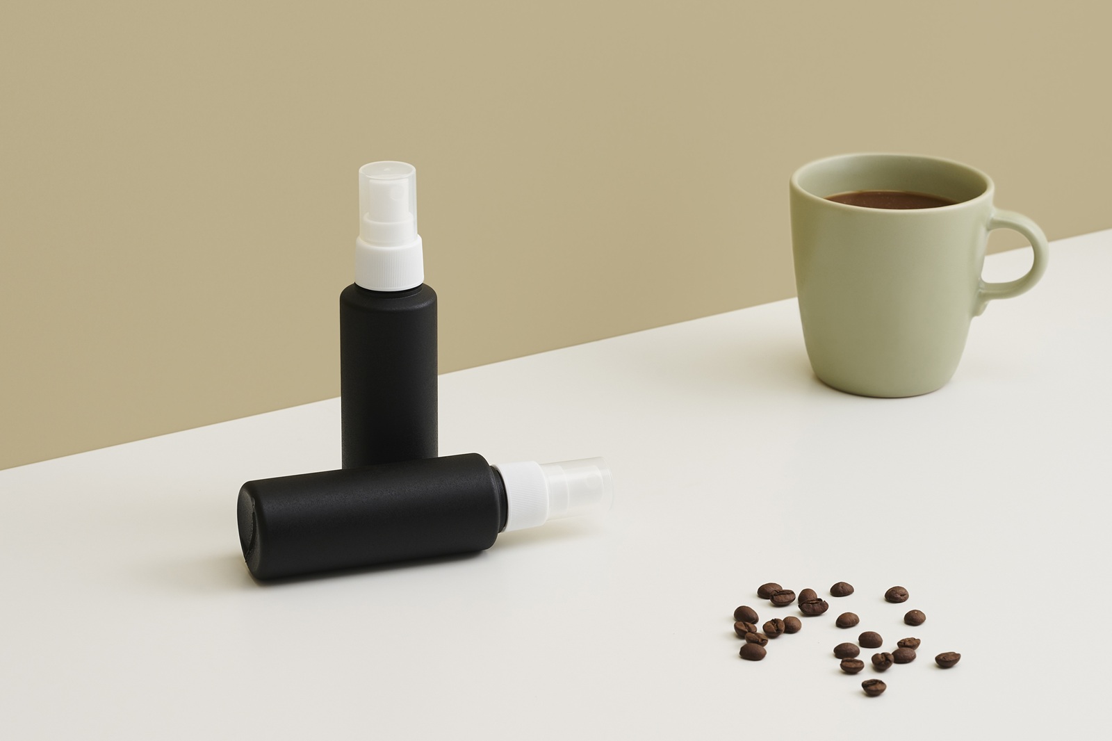 コーヒー残渣を活用したバイオマス素材のカップやボトル。独特の質感と香りを持ち、環境配慮とデザイン性を兼ね備える