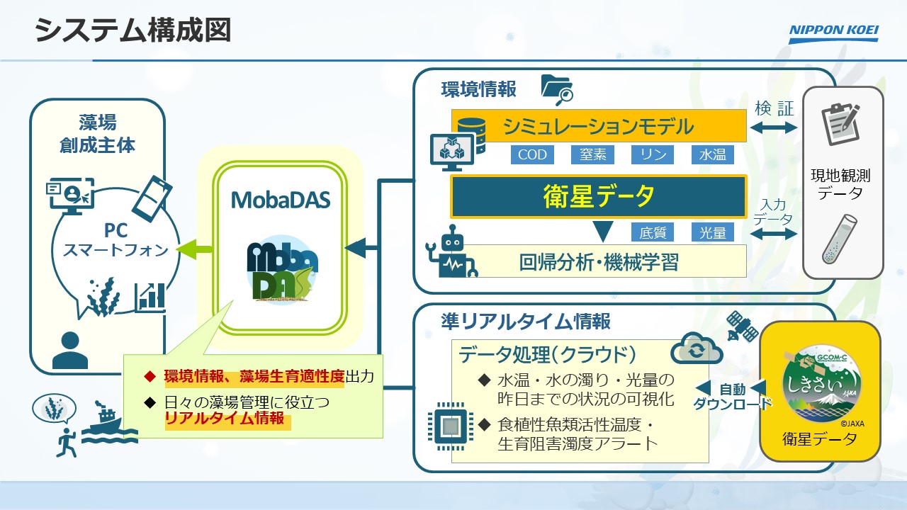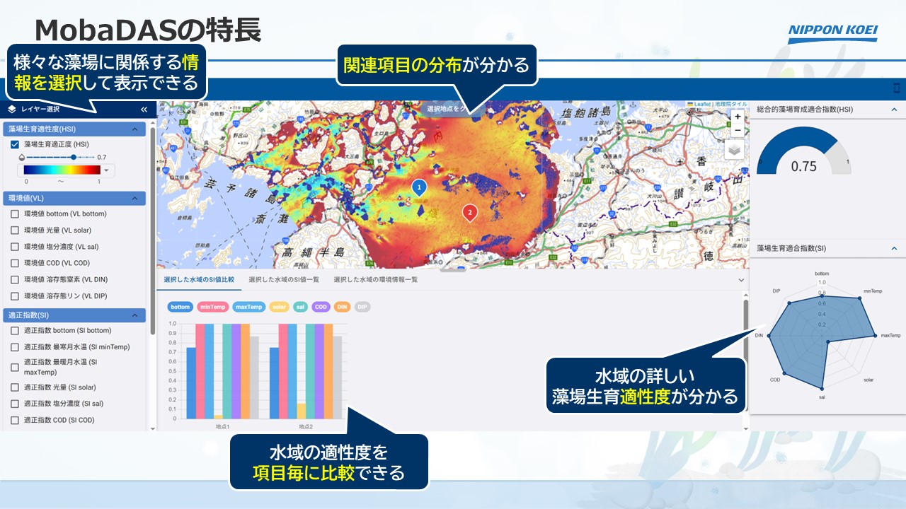 そこで日本工営は、ブルーカーボン創生支援システム「MobaDAS」の開発を進めている。ユーザーはMobaDASを通して、水域の水温や水質、光の量などの環境情報、現地観測データなどに加え、それら環境要因から算出されたブルーカーボン生態系の生育適性度の情報を手軽に把握できる。