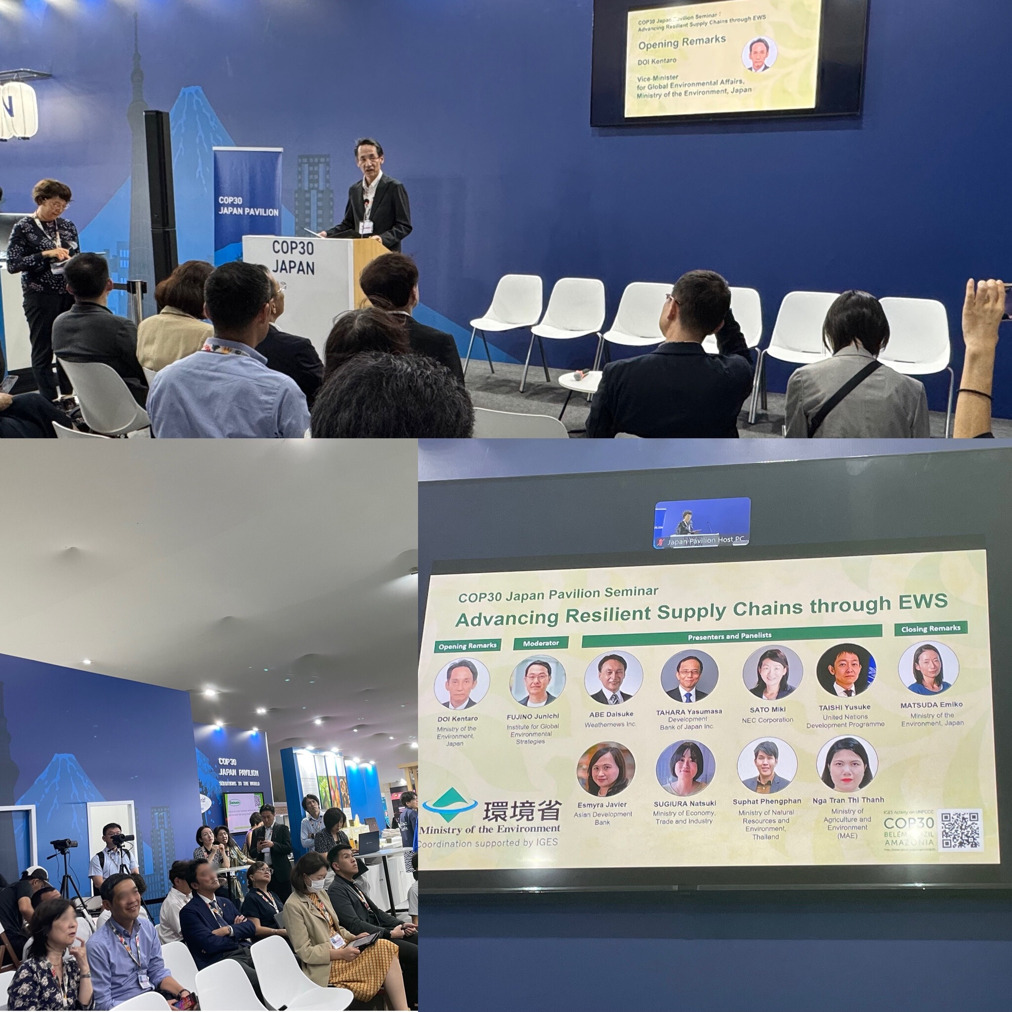 本セミナーでは、気候変動の影響拡大に伴い重要性が高まるサプライチェーン強靭化と、それを支える早期警戒システム(EWS)の可能性について議論した。とりわけ、脆弱な国やコミュニティに EWS を「ラストワンマイル」まで確実に届けるためには、官民連携(PPP)の下で EWS の汎用性・適用性を高め、バリューチェーン全体のレジリエンスを強化していくことが重要であるとの認識が共有された。