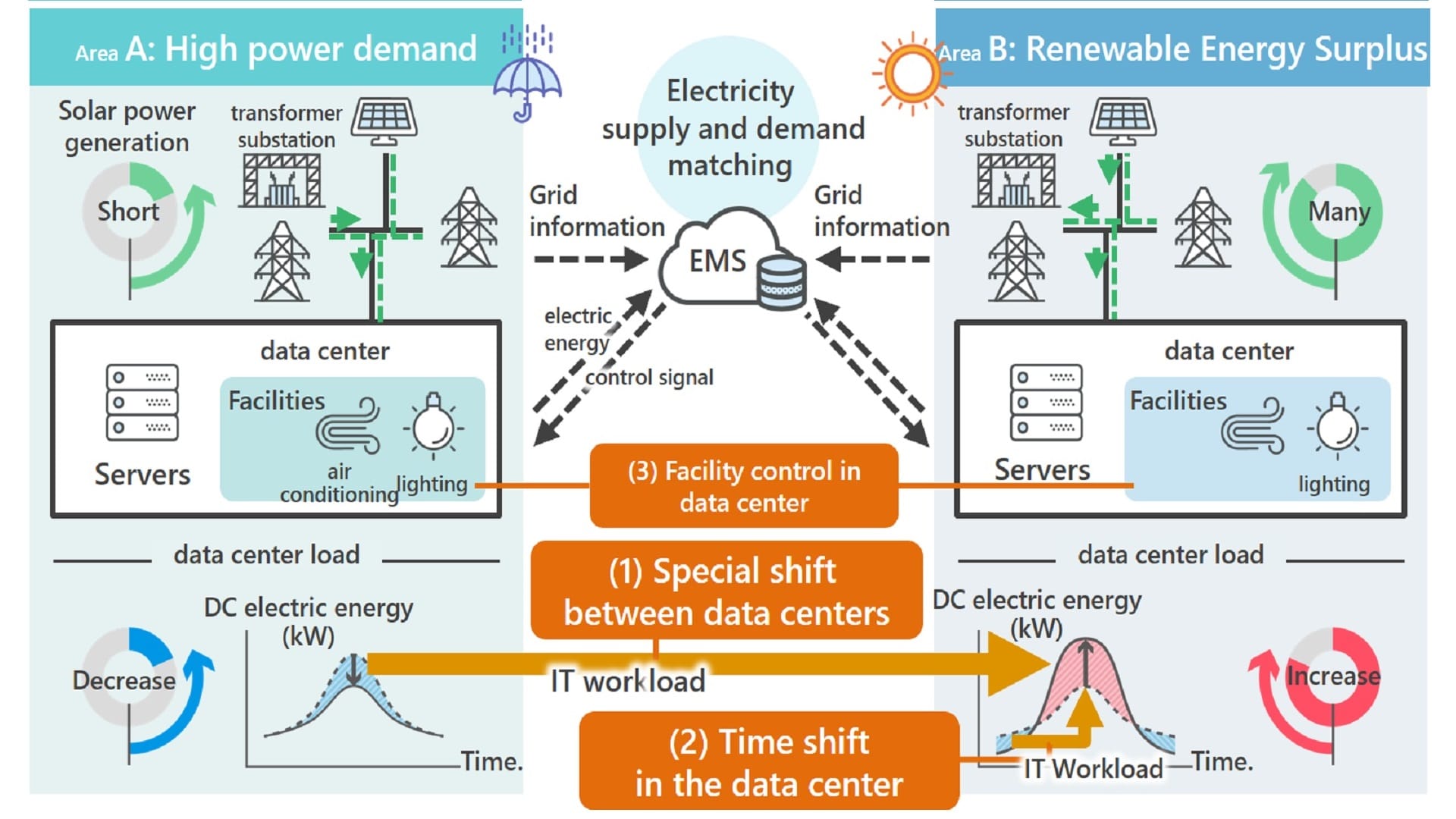 - Optimizes energy supply-demand balance by adjusting workloads to utilize power surpluses from regional renewables, to fully utilize renewables and reduce CO2 emissions.