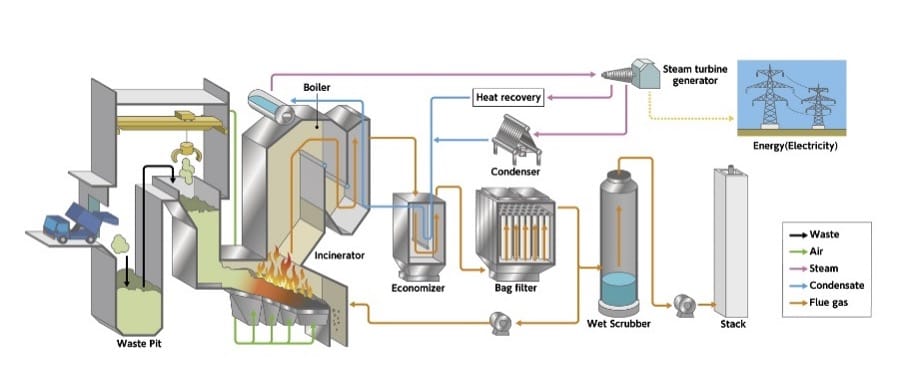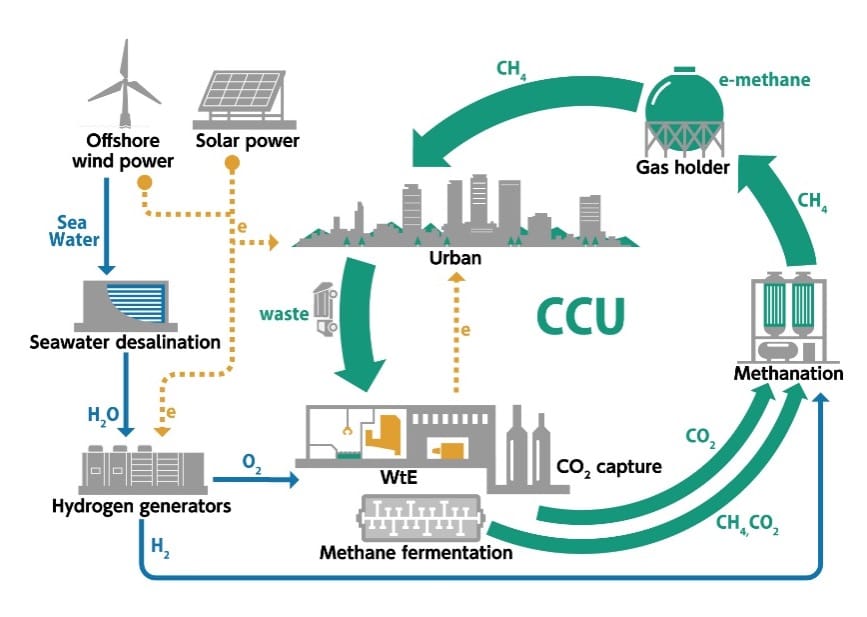 If landfilled directly, waste generates methane (CH4), having greenhouse effect 28X more than CO2. So, switching from direct landfill to waste to energy (WtE) will significantly reduce GHG emissions. With our WtE, CH4 fermentation, CO2 capture, wind power, solar power, desalination, H2 generation and methanation technologies, resource recycle of water, electricity, H2, O2, CH4 and CO2 is realized. One solution to pursue decarbonisation and circular economy in waste management systems is to move from landfill to incineration power generation, and to capture CO2 and convert it to e-methane with clean hydrogen. To realize this solution, we, KANADEIVIA Corporation, present an innovative waste management system that combines waste-to-energy, methane fermentation, wind power, desalination, hydrogen generator, methanation and efficient CO2 capture technologies in a package of existing and developing technologies. Hydrogen Generator produces oxygen and hydrogen, oxygen is fed to waste incineration for highly efficient CO2 capture, while hydrogen is converted to e-methane through a methanation reaction with the recovered CO2.