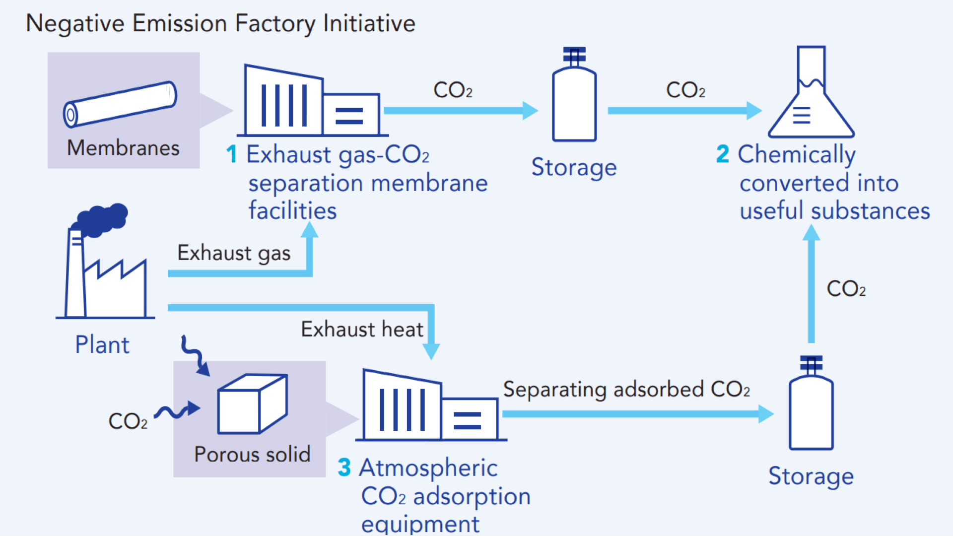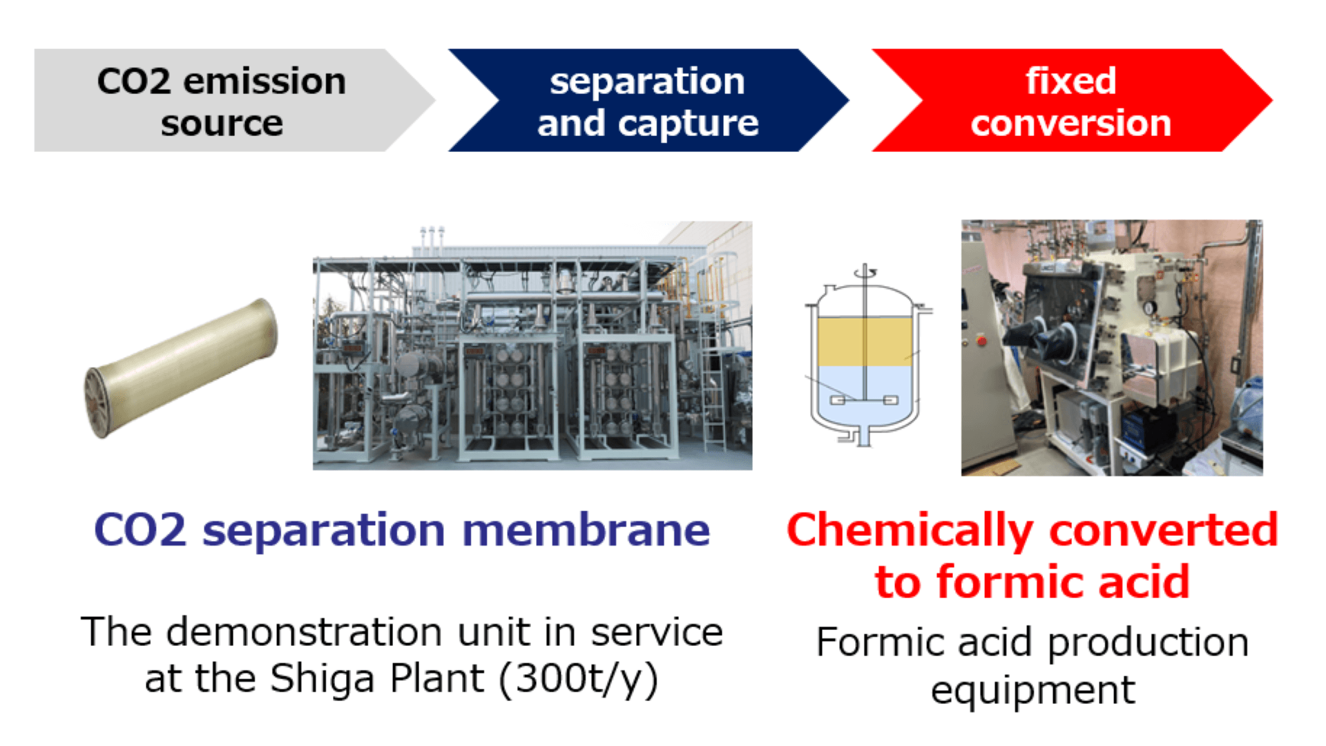 Targeting fossil fuel-derived boilers, the system uses separation membranes to highly concentrate and recover CO2 in exhaust gas, then converted to formic acid, which is mainly used as an additive in animal feedstock and as a tanning agent for leather. The system also envisions the development of DAC using waste heat.