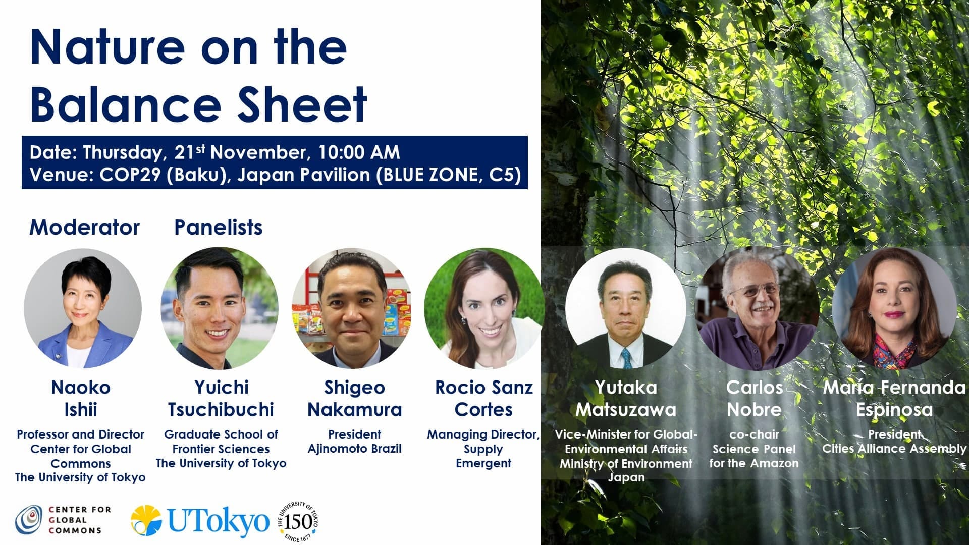 本セミナーでは「自然資本をバランスシートに」をテーマに、アカデミア、政策担当者、市場参加者、企業代表からなるパネルディスカッションが行われた。現在の経済システムが地球システムの限界を超えつつある中で、自然資本の価値を経済の意思決定に統合する必要性が議論された。アマゾンがカーボンシンクからカーボンソースになる転換点が近いこと、こうした破滅的な自然喪失を回避し、抜本的な経済システム転換を求めるには、個別企業の努力にとどまらず、自然資本の価値の可視化とその強化に資金が流れる仕組みの創設など、包括的で体系的な政策の導入の必要性、そして国際協力と官民連携が不可欠との結論で締めくくられた。