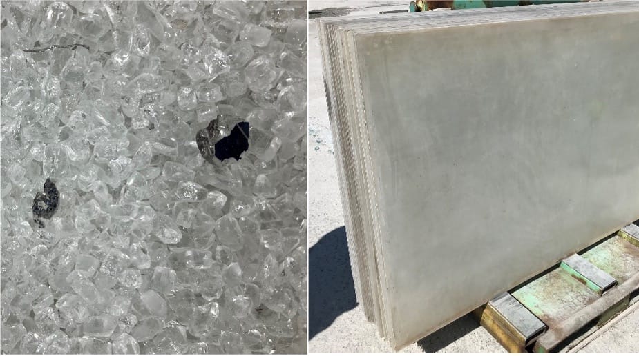 (左)割れた状態で回収された太陽光パネルのカバーガラス(異物が混入し、このままではリサイクルが困難)