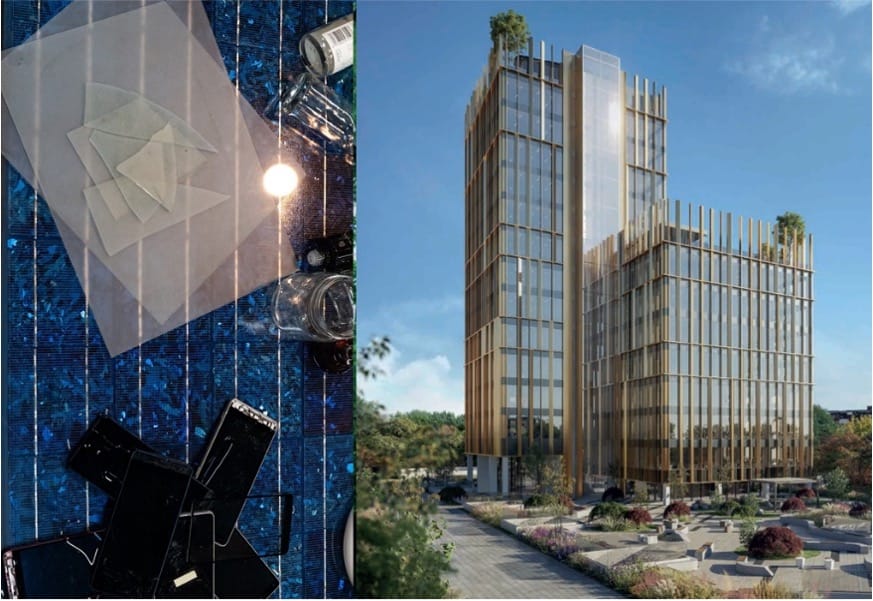 (右)リサイクルガラスを活用して建築した建物太陽光パネルは今後大量廃棄が見込まれており、その重量の6割を占めるカバーガラスの有効利用は重要な社会課題となっている。AGCはフロート板ガラスへのリサイクルを妨げてきた成分の影響を解明し、また太陽光パネルのリサイクラーとの協業でガラスが分離されたことで、リサイクルの実証実験に成功した。カバーガラスを含む廃ガラスを生産量の多い建築用ガラスに水平リサイクルすることで、産業廃棄物の削減と天然資源由来原料の利用削減に貢献する。また炭酸塩原料から発生するCO2削減、原料製造や輸送過程の温室効果ガス(GHG)排出削減にもつながる。