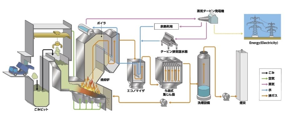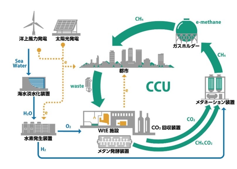 廃棄物を直接埋立すると、CO2の28倍の温室効果を持つメタンが埋立処分場から発生するので、直接埋立からごみ焼却発電(Waste to Energy)に変更することで、GHG排出量を大幅に削減できる。 廃棄物焼却発電、メタン発酵装置、CO2回収装置、洋上風力発電、海水淡水化装置、水素発生装置、メタネーション装置によって、水・電力・水素・酸素・メタン・CO2が資源循環される。 廃棄物処理を中核とした「Waste to X」のシステム・パッケージ