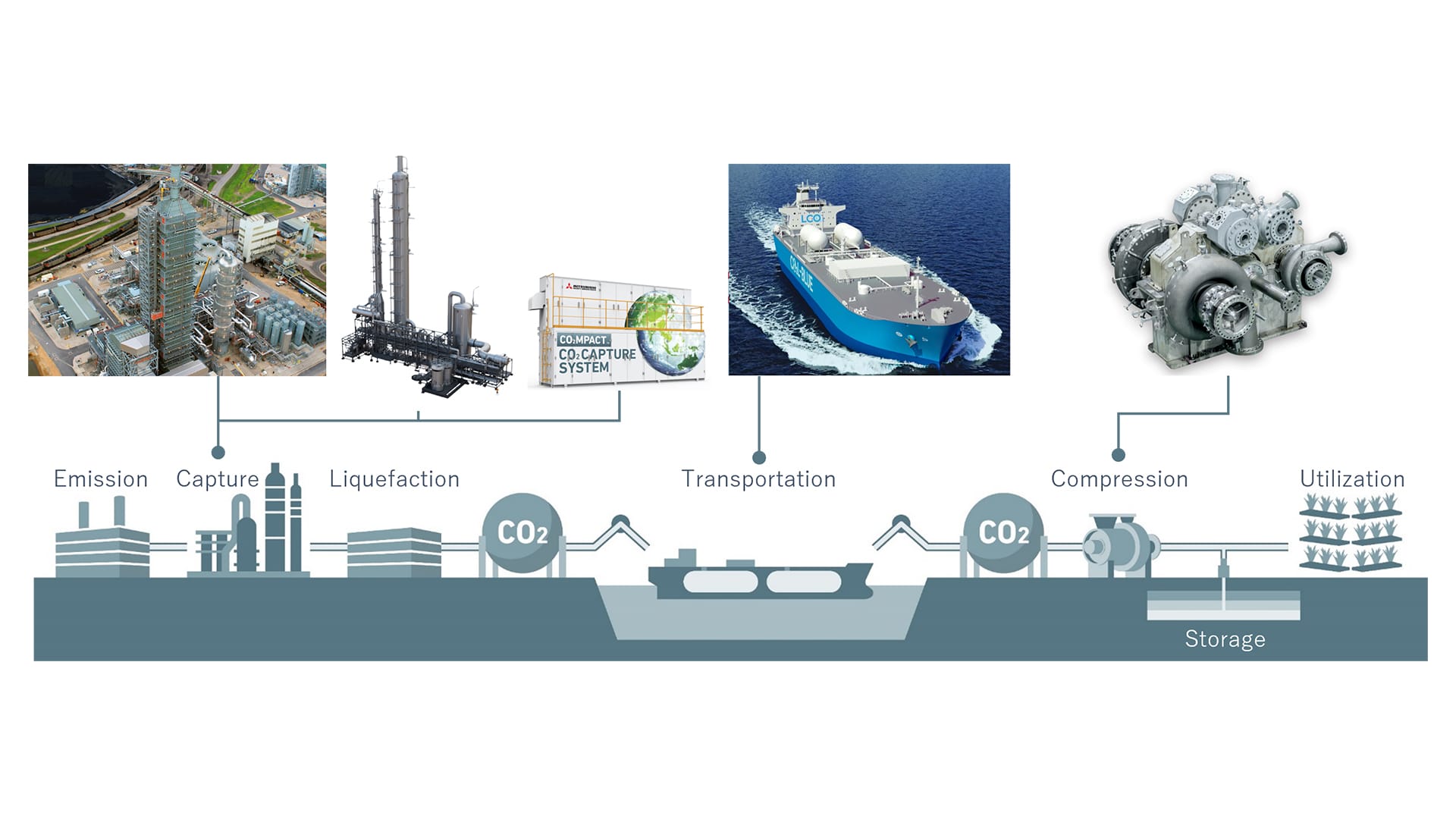 - (2)先進的CCUSソリューション:脱炭素社会の実現には、CO2排出量の削減と共に発生したCO2を回収・輸送し、リサイクル・貯留する取り組み(CCUS)が必要となる。弊社グループは、CO2回収システム、液化CO2輸送船、CO2コンプレッサなどCCUSを構成する幅広い製品・サービスを有しており、これらの提供を通じてCCUSバリューチェーンを構築し、カーボンニュートラル社会の早期実現に貢献していく。