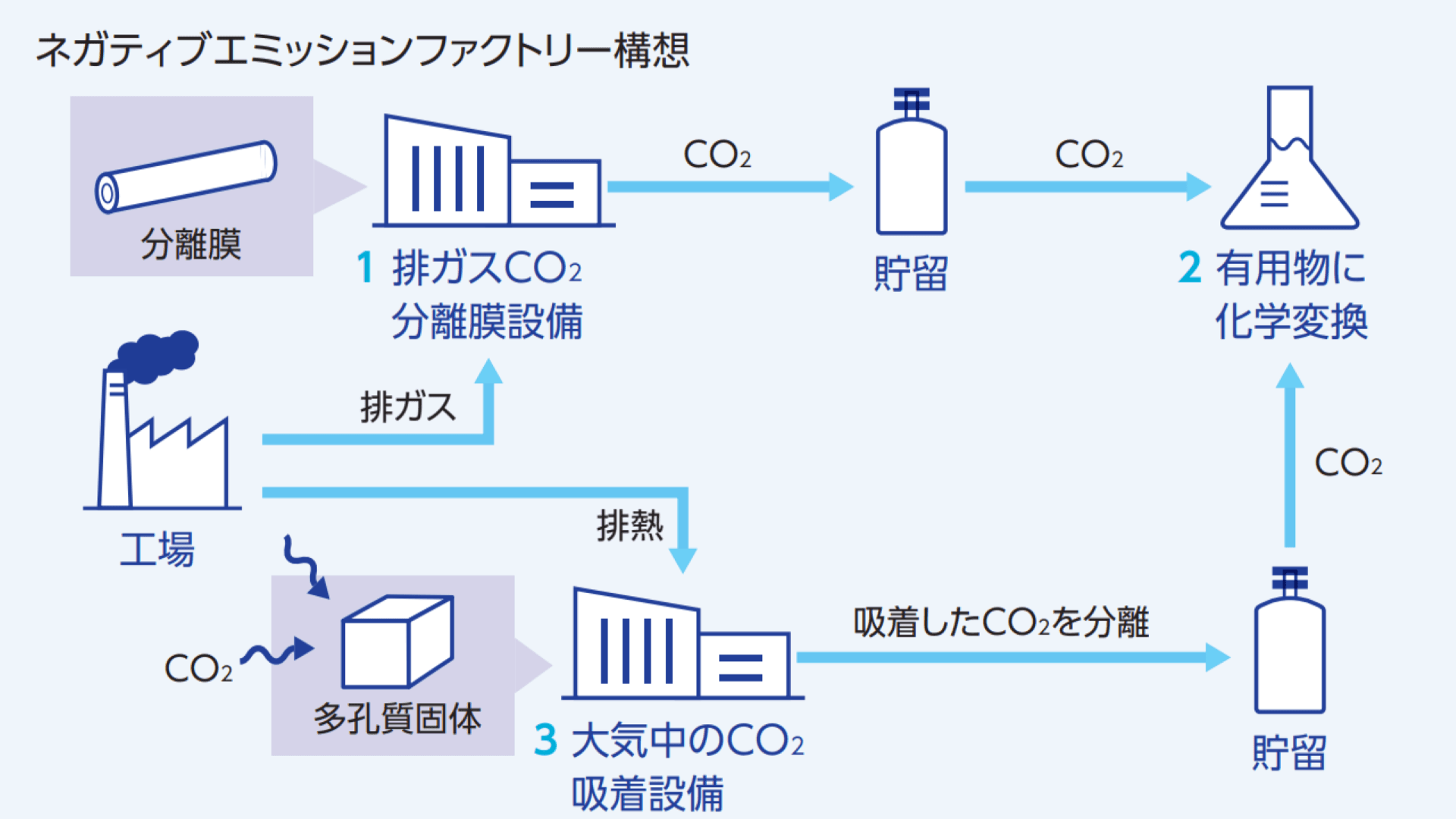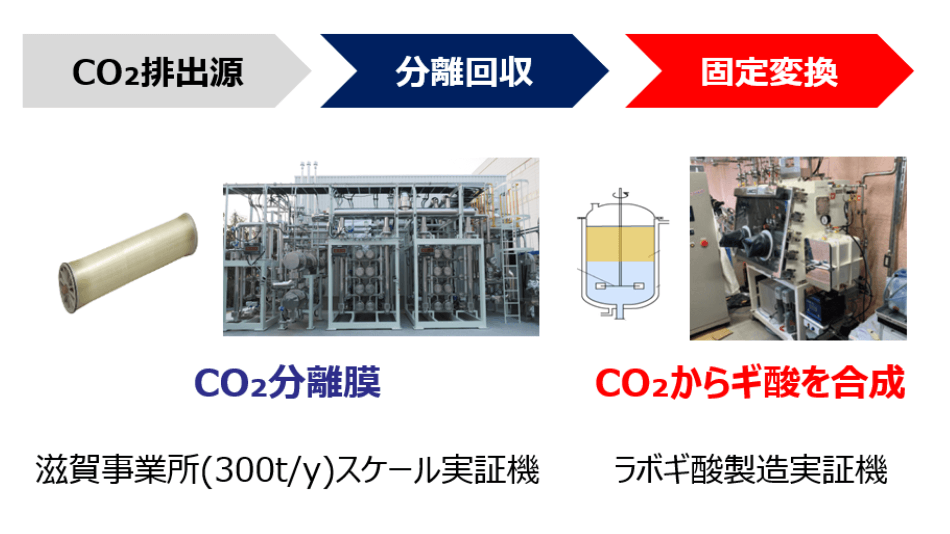 本システムでは、製造業で使用される化石燃料由来のボイラーをターゲットとし、排ガス中の低濃度CO2を気体分離膜技術で高濃縮回収した後、化学変換技術により主に家畜飼料の添加剤や皮なめし剤に用いられているギ酸へと変換することを目指している。また、排ガス中の排熱利用などエネルギー効率の良い大気CO2回収技術を開発し、複合的なシステムとする事も想定している。