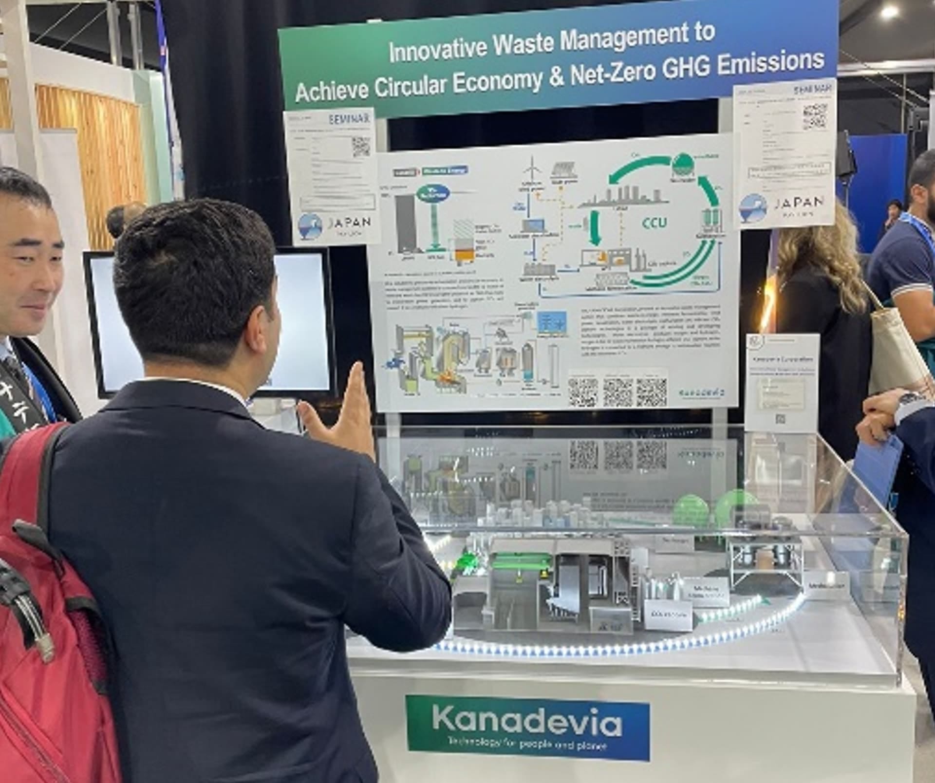廃棄物分野での資源循環およびGHG排出ネット・ゼロの実現をテーマとし、模型、パネル、動画を展示した。 123ヶ国・1000名以上の方にご来場いただき、廃棄物処理分野における脱炭素に高い関心があることが伺えた。 廃棄物焼却発電やメタン発酵など、複数の廃棄物処理技術を展示することで、各国・地域の廃棄物処理の状況に合わせた気候変動対策に貢献するソリューションを提示することができた。